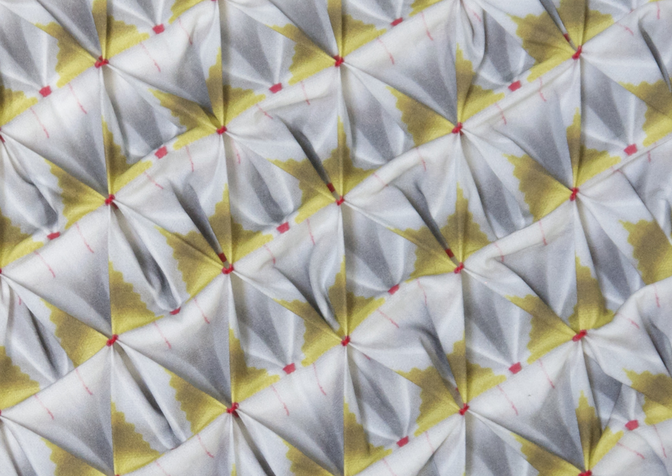 Ealish Wilson’s collection of textiles made under label Design Bahn are developed through a laborious process of sculpting trompe l’oeil pieces from pleats and smocks, that are then photographed and turned into 2D prints.