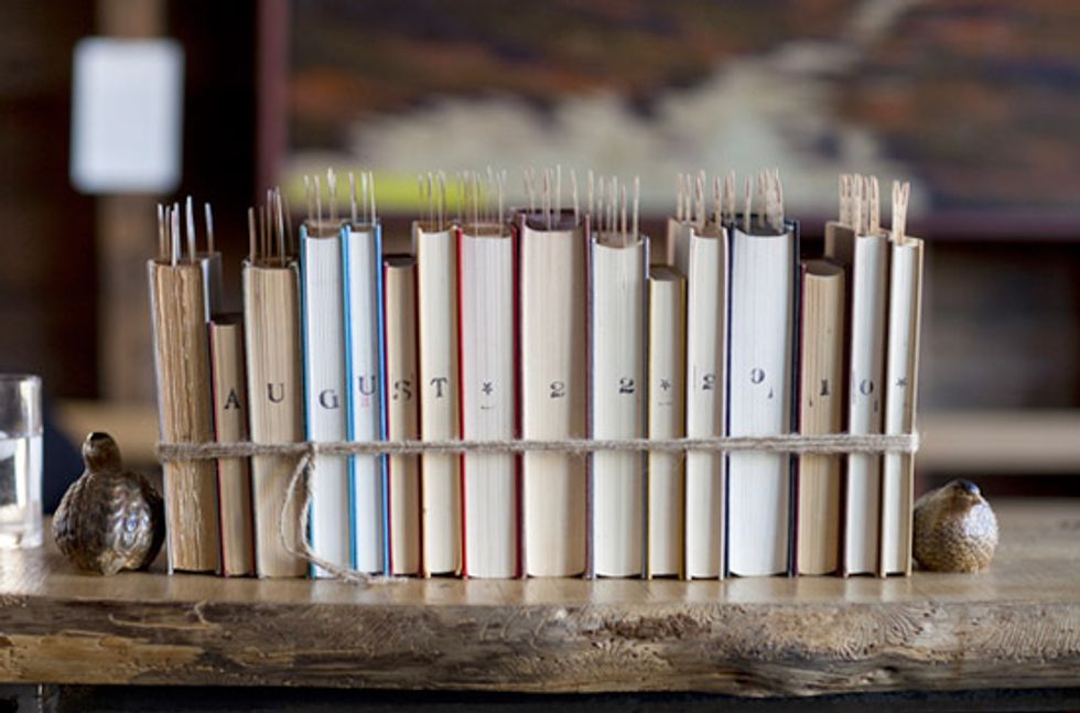 Since we were working on a tight budget I came up with some DIY projects to get a whimsical look and feel without a huge price tag. I re-used old books from thrift stores, ordered library cards and pockets online, hand-wrote and stamped cards, and crafted all the details by hand. My incredibly talented and creative friends were also a huge help in making it happen. [Note the table cards tucked into the row of vintage books with stamped spines—how creative can you get?]