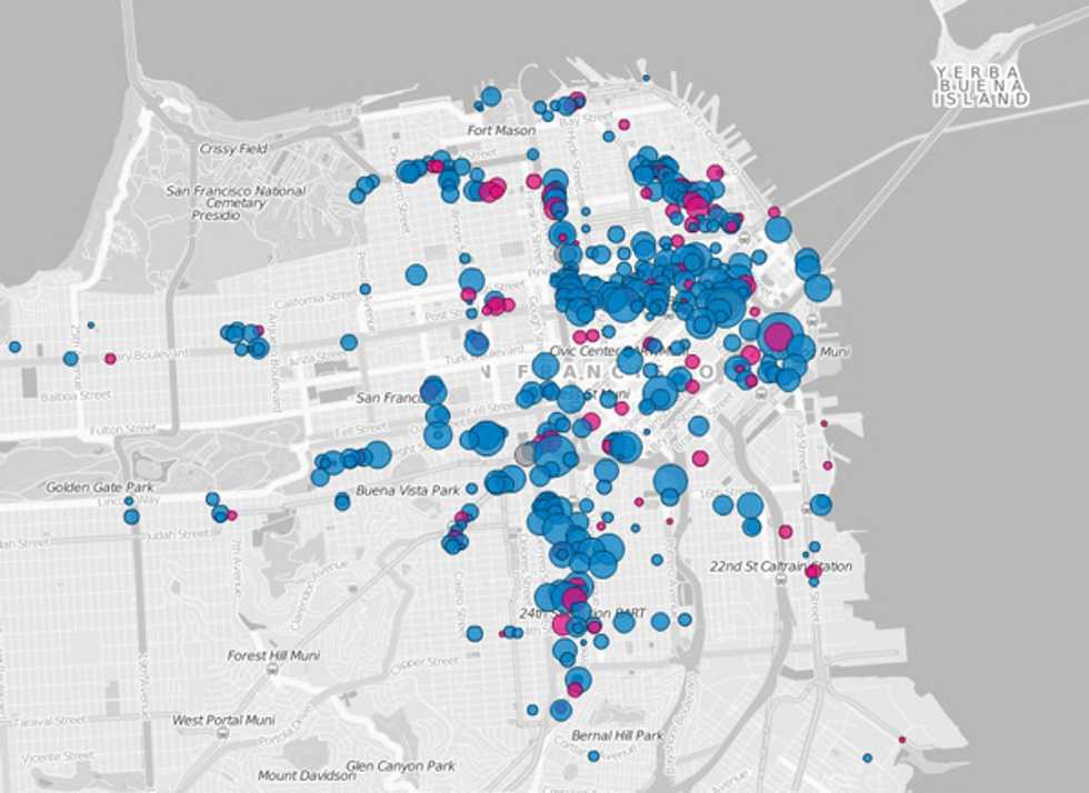 Check how your favorite spots weigh in here. Lots of blue (which is for guys) in bars and clubs and lots of pink (which is for girls) in markets and parks.