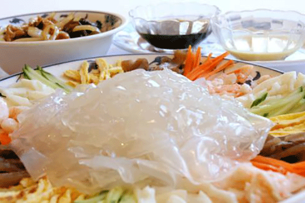 Rarely found on Chinese restaurant menus in America, these mung bean noodles and shredded tofu skins are beautifully arrayed with vegetables, mushrooms, and cooked squid. The dish is accompanied with sauces to toss in and share as a group at the table. // 2190 Bancroft Way, Berkeley