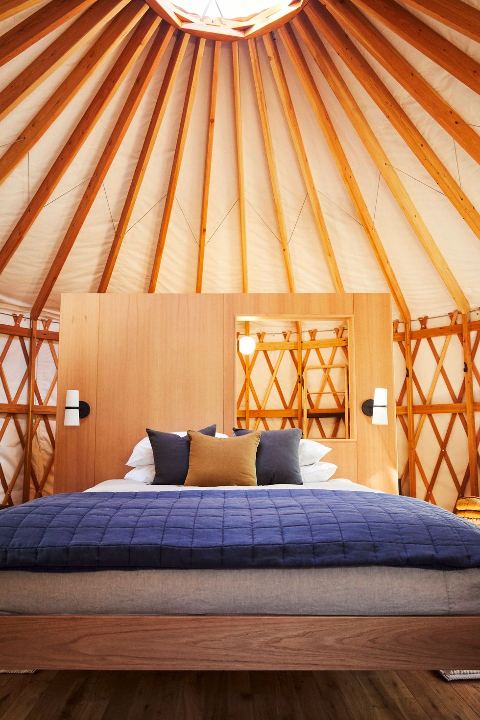 A short drive or hike from the cabins you'll find a campground where seven seriously luxe yurts have riverfront views that put the glam in glamping. Inside, there's a spacious Cal king bed, a sleeper sofa, fireplace, bar cart, and gorgeous bathroom with a soaking tub. One extra-large yurt is set on a private cliffside, completely off the grid; the only electricity is a propane fireplace.