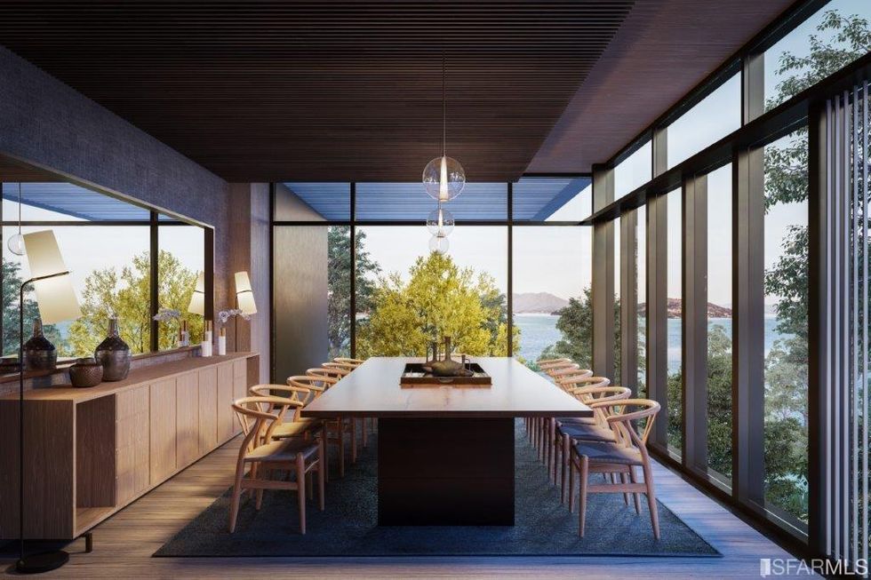 Ample windows and glass doors ensure the living room, anchored by a stone fireplace, is well-lit and has showy views. The dining area easy transitions into the chef's kitchen where you'll find Arclinea cabinetry, natural stone countertops, Dornbracht fixtures, a Sub-Zero refrigerator, and Wolf gas cooktop.