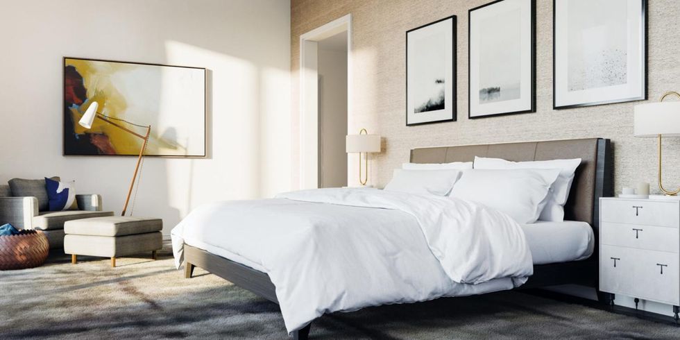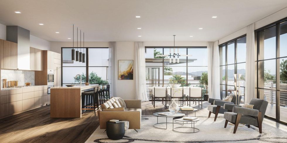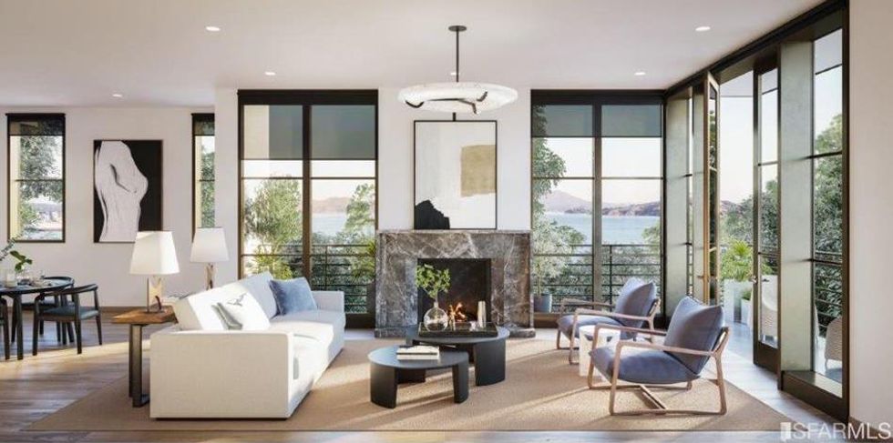 In truth, the developers here have done an excellent job of creating the mirage. There are sandy beaches, five miles of trails, 72 acres of parks and green space, and a 10,000-square-foot Aidlin Darling–designed Island Club with an outdoor heated pool, gym, sauna, and yoga room. But let's get to the home, where floor to ceiling windows throughout bring all those urban island vibes indoors.