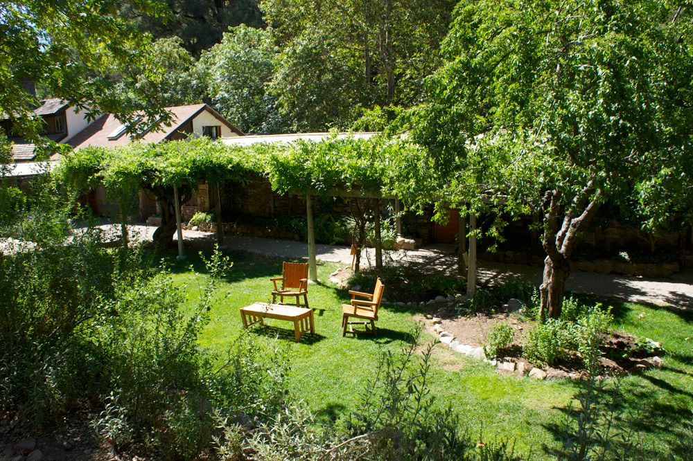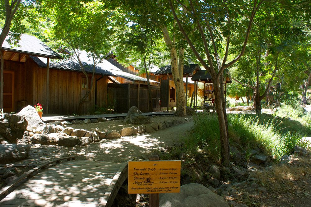 Guest accomodations ($100 to $407 per night, depending on retreat status or shared/non-shared rooms) range from shared dormitories to modestly appointed historic cabins along on the creek, none of which have electricity and all of which are lit with kerosene lanterns. The only electricity, from a solar array on the cliffs above, runs to the administrative office and to the kitchen, where a group of students shares cooking duty through the guest season and continues Tassajara's long tradition of good food.